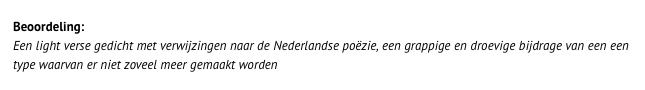 Als antwoord op de proefwerkvraag ‘Wat voor type gedicht is dit?’ valt dit zeker goed te rekenen, maar ik vind het wat ver gaan om het een beoordeling te noemen.